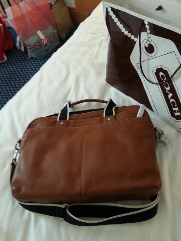 8.11一早起来吃了早饭,乘坐地铁去了东荟城。正好碰到coach在搞打折活动,原价商品打7折或8折,然后搞活动在打7折,买了男士背包港币3220元和皮夹港币1446元。女士背包港币2622元和皮夹港币1764元。