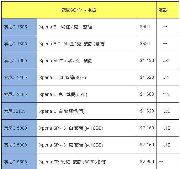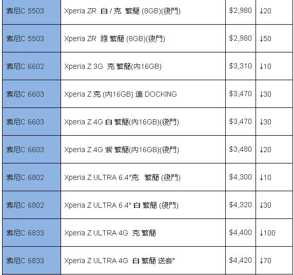 其实大家也习惯了索尼手机高开低走,特别是价格超过4K港元的机型,在短短几周后便有超大跌幅。最新款旗舰机Z1有较大下降,下潜空间很大。而巨屏手机Z ULTRA依旧保持下跌,需要提醒大家注意的是,Xperia Z Ultra后来推出的4G版本价格与3G版本相差无几,如何选择也无需多言。5寸靓机Xperia Z在近期稳定了下来,不排除接下来的时间会有进一步降价。