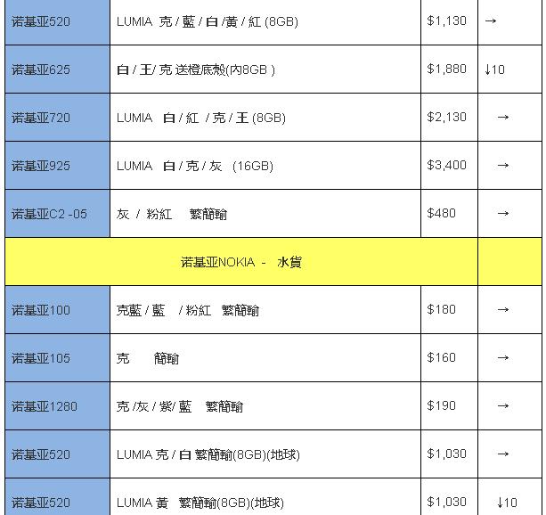 以下报价,如表内无特殊说明,则为原装配件的行货/后行/水货/上台机报价,一般来说原装配件为一电一充,“克”意思为黑色,“繁简英”是指手机所支持的语言,“繁简输”是指手机支持的输入法,“笔画”是指手机的键盘有笔画刻字。