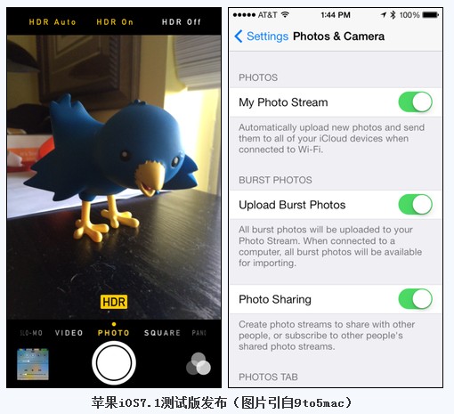 据悉,相对于此前的版本,iOS7 Beta修复了一些Bug,并提升了运行性能,同时增添了一些新的设置功能,比如在设置中可以设置使用黑色键盘,苹果iPhone5s可以将连拍照片上传到照片流中,可以将界面调暗,可以在辅助功能等选项中将Dock栏和文件夹背景色调为深灰色等等。另外,其天气和股市应用使用的雅虎LOGO已经更新,通知中心在没有新消息时会显示无通知,在系统加粗字体时也不会重启设备了;iOS7.1对拍照界面再次进行了改善,高动态拍照(HDR)可以自行调节范围。