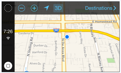 通过iOS in the car,用户可以完成通话、收发短信、导航地图、控制音乐等操作。最为贴心的是,我们在第一次使用iOS in the car时会看到提醒大家关注路况的安全提示。界面设计方面,iOS in the car的界面状态栏在左侧展示,提供了时间、网络的信息查看,同时还配备了虚拟Home键。从最终的界面效果来看,我们可以感受到这种风格也是和iOS7扁平效果相吻合。