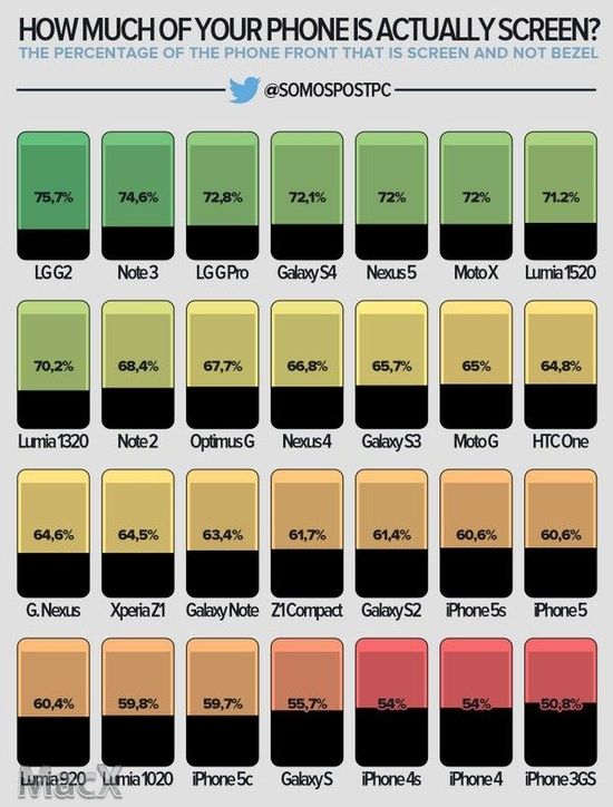 结果LG G2以75.7%的屏占比获得了冠军,而很多型号的iPhone的屏占比都低于60%。今天早些时候,有传言称下一代iPhone可能采用无边框设计,这样会进一步增加屏占比。