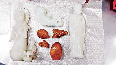 当日,在皇岗口岸入境小车道海关监管区,一辆两地牌营运七座车被海关关员调研挑中检查。车上一位男性香港旅客手中提的购物袋引起了海关人员的注意。「这位旅客提一个蛮大的环保购物袋,裡面似乎装一个方方正正的物品。当时旅客神情很焦虑,格外小心地保护这个购物袋。」查验关员告诉记者,他立刻对购物袋进行了检查,发现购物袋中放一个厚纸盒,打开纸盒后,关员发现裡面放七件物品,全部用防震塑料纸严密包裹,拆开防震塑料纸后,发现这七件物品全部为雕工细緻、造型精美的玉石摆件。这些玉石质地緻密细腻、温润光洁。经初步鉴定,其中4件为田黄摆件,3件为白玉摆件。