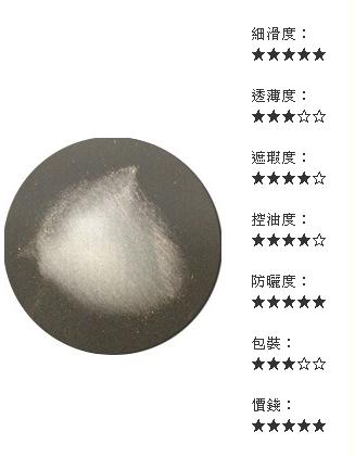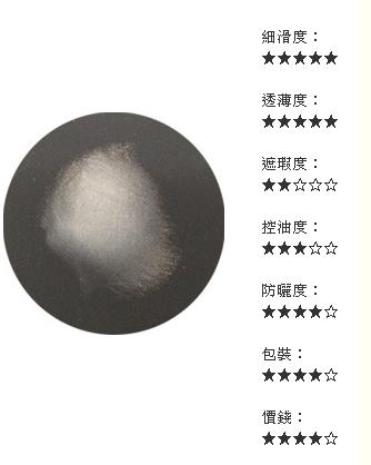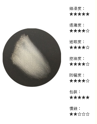 粉质幼滑而且内含非常微细的银色珠光粒子及白色蓝宝石粉体,打造柔焦效果之余亦能创造光泽感。防晒度及保湿度亦很足够,是暗沈偏乾性肤质女生的恩物。