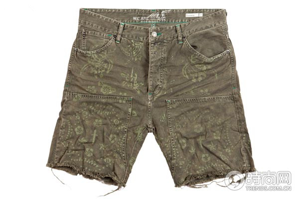 大地色系短裤上缀以装饰性口袋贴花和印花图案,裤脚处的破损拉丝处理极具标志性的Destroyed 磨损处理效果。