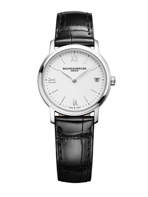 极致永恒的腕间臻品,这只直径33毫米的抛光精钢腕表搭配哑面白色表盘,结合罗马数字与纤细拉长的时标,展现出绝妙的平衡美感,质朴中彰显隽永。该款腕表的尺寸最适合都会精英日常佩戴,简洁低调的设计只呈现最精髓的极简之美;内置瑞士制造的石英机芯,提供小时及日期显示。设计精巧又不失男子气概,本腕表搭配经典的亮面黑色鳄鱼皮表带及针式表扣,适合于任何场合佩戴,尽显尊贵气质。经典简洁的腕表素来是父辈们所亲睐的风格,而沉稳精致的设计更透露出成熟男士们独树一帜的品味。