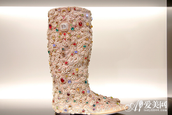 这双裸色靴子最给力了,整个鞋子都镶嵌了各色的宝石,想要追求华丽感。