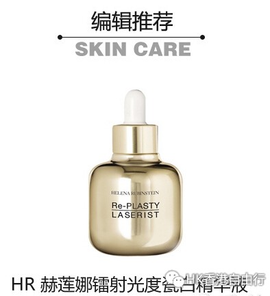 HR 赫莲娜镭射光度瓷白精华液 :这款精华液配合皂角素、没药醇、透明质酸等多种尖端淡斑养肤成分的崭新组合,复制光子嫩肤的光热作用,帮助肌肤由里到外全面抗御衰老变色,卓效淡褪色斑,减淡红印,平滑瑕疵,展现匀滑通透的美肌质感。
