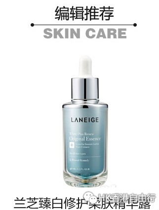 兰芝臻白修护柔肤精华露:兰芝革命性美白科技从肌源阻截分解黑色素,提升肌肤分解黑色素的能力,同时配合绿茶精粹滋润肌肤,肤色一级一级亮白起来,带来傲人的匀净无暇。这款精华露是明星产品,乳液状精华,蕴含爱茉莉独创成分,有助呈现白皙透亮肌肤。
