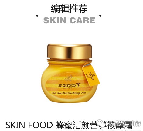 Skin food 蜂蜜活颜营养按摩霜:汲取珍贵黑蜂蜜萃取物与精选蜂王浆萃取物,为干燥松弛、失去活力的肌肤注入丰沛营养,是一款高保湿高营养的改善皱纹功效性修护按摩霜。