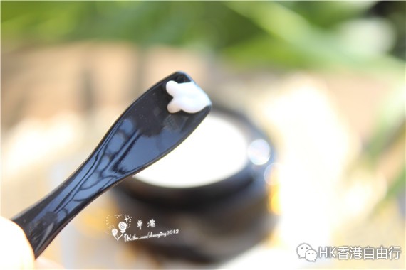 如丝缎般光滑的表面,不似常见的眼霜质地,完全没有流动感呢。心中忐忑,不知道会不会厚重,会不会油腻呢?随附一个精致小勺,插进去的时候,一切担忧即刻消失了。