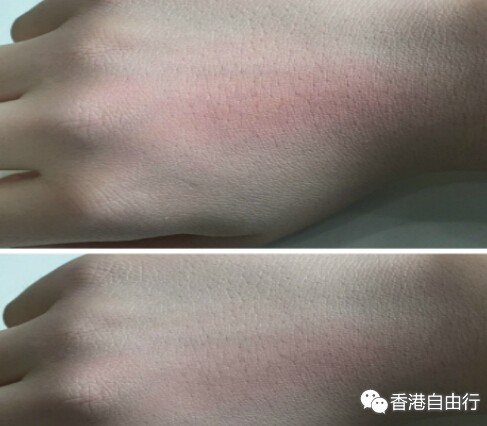 评测结果:在涂抹过该产品的手背上喷上水雾,我们可以看到手背的色泽完全不受影响,由此可以得出too cool for school的腮红防水性能还是不错的,由此我们一定要注意在卸妆的时候卸得干净!