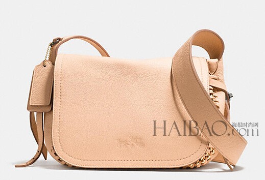 明媚的杏黄色在奢华手工工艺之下熠熠生辉,蔻驰 (COACH) 迷你翻盖式斜挎包以西式实用粒面皮革搭配手工镶边拉链,掀起2015早春里的甜美式风潮。