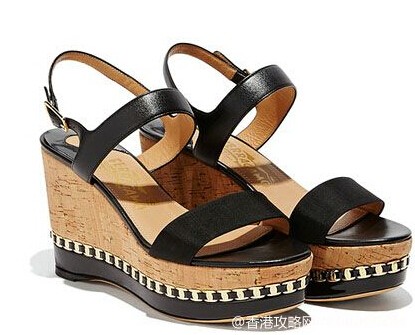 坡跟凉鞋 麂皮材质脚跟 5.5厘米 踝带坡跟凉鞋,拼接缎带。鞋底饰有金色链条;包覆鞋跟。