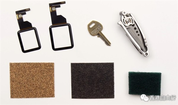 事实果真如此么? 来自YouTuber Unbox Therapy的视频记录了对运动版Apple Watch使用的Ion-X玻璃面板进行的严苛测试。 测试使用了钥匙,小刀,钢丝棉,砂纸对Ion-X面板进行了高强度的摩擦,结果令人吃惊不小:Ion-X面板在四种测试中扛过了前三种,表现相当出色,只是在最后一个环节的砂纸测试中才留下了较多的划痕(这个也就不必太较真了吧,毕竟石英的硬度是众所周知的)。 负责任的说,尽管运动版Apple Watch没有配备蓝宝石屏幕面板,但Ion-X面板的轻度足以应付大多数人每天的日常使用所需。 Ion-X应该是大猩猩的改进版而非马甲。