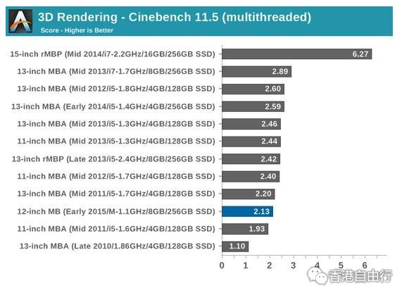 硬件部分可能是大家在选购中最为头痛的部分,两者都采用了英特尔最新的Broadwell核心、14nm工艺的处理器,那么谁的性能更强呢?答案其实从主频上就能看出:MacBook Air。事实上,MacBook采用的酷睿M处理器定位介于Atom和酷睿之间,主要特点在于低功耗、可实现无风扇设计,而性能部分又比Atom略强一些,但无法达到酷睿的级别。那么,MacBook与MacBook Air的性能差距又是多少呢?一起来通过跑分测试大概了解一下。