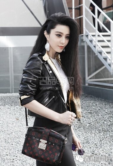 2015秋冬巴黎时装周路易·威登 (Louis Vuitton) 秀场上迎来了重量级的华语明星嘉宾范冰冰。她以80年代风格为主题,顶着一头蓬松的侧梳发型,身着LV黑金配色皮革短夹克,内搭白色撕裂感针织衫,下身穿着黑色开衩半裙,肩背LV 2015春夏系列手袋,硬挺的“重机女郎”造型气势磅礴,看得人眼花缭乱。