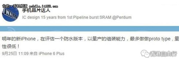 近日有网友爆料称,明年新一代iPhone(iPhone 7)在评估一个防水版本,只不过从目前批量生产的能力来看,最多是做成原型样机,要想实现量产的可能性非常低。当然,这并不代表该机并不会量产,毕竟,距离iPhone 7的发布日期还很远,在这期间什么都是可以发生的。