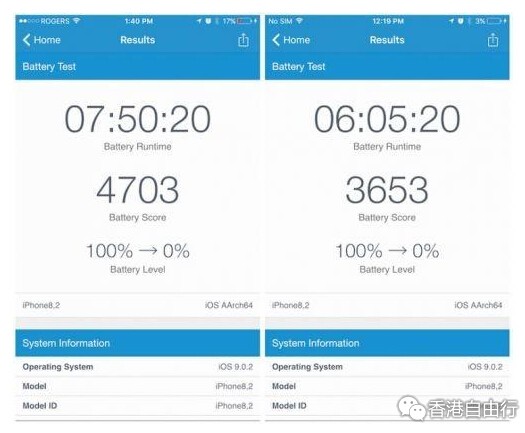 而在国外知名论坛Reddit上,更有不少网友晒出GeekBench软件对iPhone 6s对两个版本A9处理器的续航测试成绩显示,在同样设置和使用情况下,搭载台积电A9处理器的iPhone 6s续航事件居然要比搭载三星A9处理器的版本长近两个小时,这个结果多少使得对续航比较看重的用户感到十分的纠结。