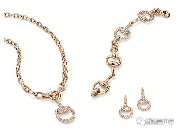 该玫瑰金套装由手链、项链和耳坠构成,马衔全部由钻石镶嵌而成,独树一帜。项链上的马衔吊坠镶嵌超过2克拉的钻石;精美的手链则包含多个标志性的马衔元素,镶嵌钻石总重达4.69克拉,光芒熠熠。耳坠上的马衔元素则呈现雕塑感,耳坠整体全部密镶钻石,璀璨摄人心。该套首饰在设计上做到了让所有钻石时刻不掩光彩,代表了Gucci在专业首饰领域的精湛技艺。