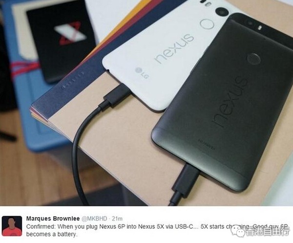 由于华为 Nexus 6P和LG Nexus 5X都支持正反插的Type-C 接口,并标配一根双头Type-C USB 数据线,所以国外网友最新想到了一个不同寻常的玩法,这便是将两部手机用数据线连接到一起,最后竟然发现Nexus 6P居然可以为Nexus 5X 充电。