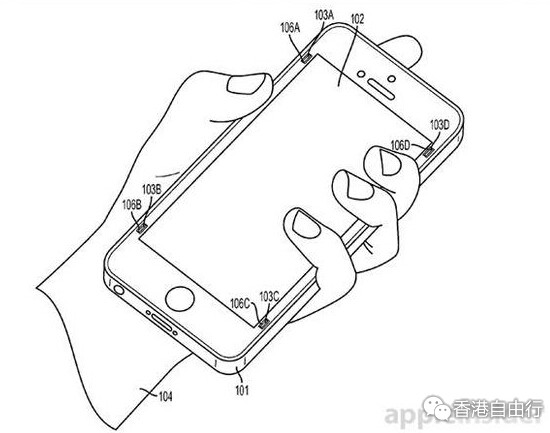 为了防止意外跌落摔坏iPhone的显示屏,苹果最近申请了一项新专利,这项专利是一种可以自动伸缩的iPhone屏幕保护器,当设备在掉落的过程中,它可以自动从屏幕的四周伸出缓冲器,防止屏幕直接和地面接触,起到一定的保护作用。