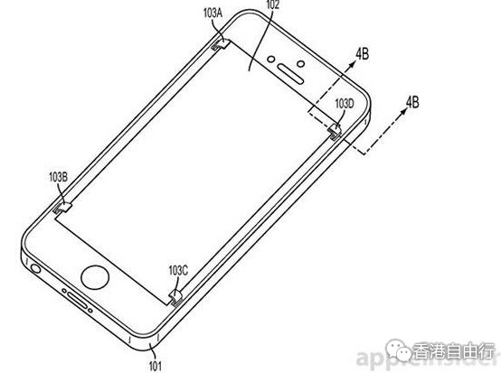 这项专利的基本思路是为iPhone或类似的电子设备配备多个可伸缩的标签。当系统被激活后,会自动向屏幕的上方伸出四个缓冲器,并且比屏幕高出一部分,减少屏幕与地面接触的概率。在某些情况下,这个保护器可以在屏幕上方形成一个曲面,吸收掉落产生的能量。其实,苹果已经在许多方面都发明了类似的智能减震器设计。