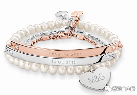 充满女性魅力的珍珠手链(¥790)搭配可刻字爱心纯银吊牌以及925纯银(¥1,190)或925純银镀18K玫瑰金手链(¥1,790),两款皆有心型精细氧化锆嵌侧边与可自由刻字的表面闪耀为爱发声。