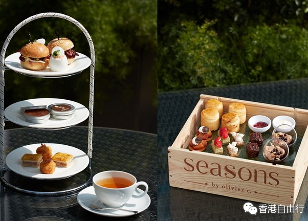 不论是在购物后稍作休闲或是与知己好友茶聚畅谈,甚或只是想忙裡偷闲,下午茶都会是你尽情放松,写意享受的悠然选择。Seasons by Olivier E.餐厅以法式经典作主题,细意打造午后时光的优雅风尚,下午茶采用经典的三层架及餐厅招牌木酒箱,呈献由总厨精心挑选的各式精致小点,展现丰富多样的视觉与味蕾享受。咸点方面有烚蛋酿鸭肝忌廉、法式炸虾多士、龙虾啫喱等,而甜点方面则除有抹茶慕丝蛋糕、榛子黑朱古力、栗子蛋白挞外,亦少不了餐厅一向大受欢迎的传统原味及提子松饼,连忌廉及自制果酱。