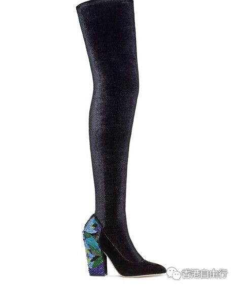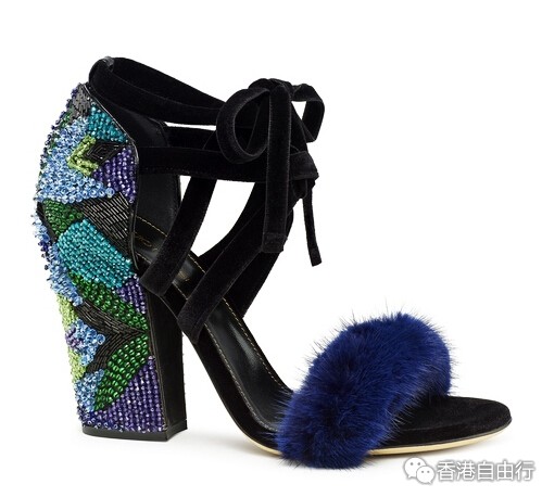 晚上,刺绣于鞋跟上的珠片在软身丝绒上熠熠生辉;配搭同色水貂皮草搭带的凉鞋更显独特。