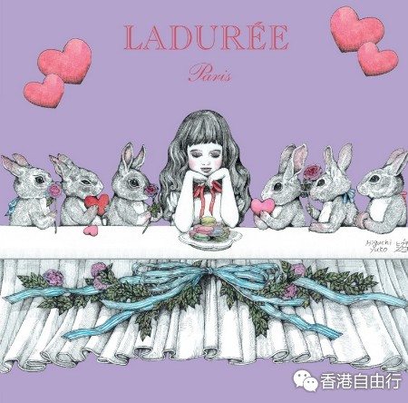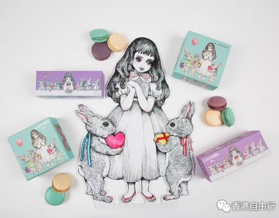 在这个复活节,Ladurée将会与日本著名插画家樋口裕子联手合作推出礼盒,她梦幻般的创作及其充满微妙情感的诗意正反映Ladurée充满爱和温柔的世界。礼盒上绘画了一个被小白兔围绕着的女孩,充满爱和愉悦的气氛。盒内柑橘杏仁蛋白小圆饼,两块杏仁蛋白小圆饼夹着注满柑橘柠檬的软滑奶油馅料,清新感觉令人精神为之一振。