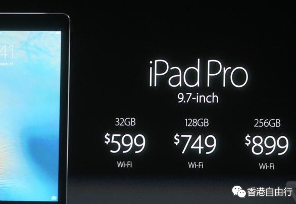 9.7英寸iPad Pro并加入对Apple Pencil的支持,同时首次加入了256GB存储容量版本,售价599美元起(32GB),128GB版749美元,256GB版899美元。该产品将于3月24日接受预定,发售时间为3月31日。