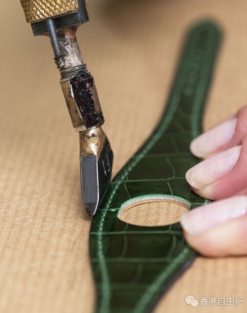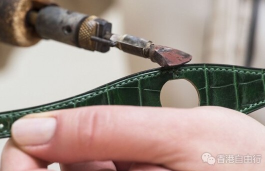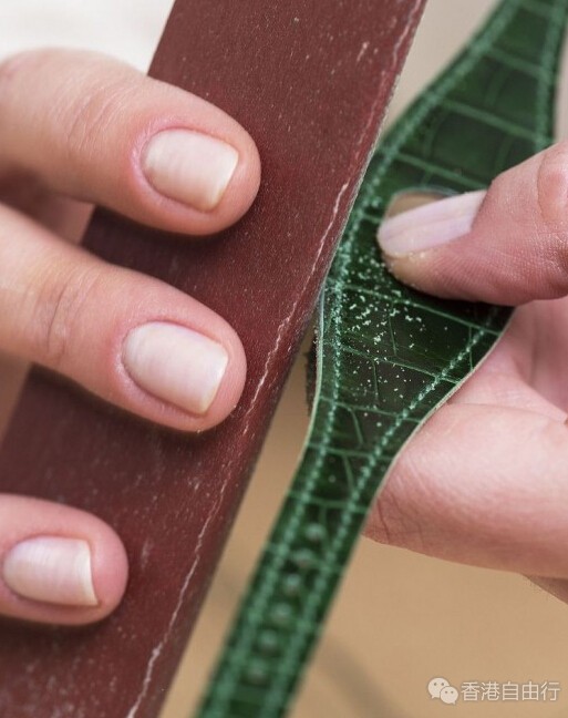 今年,爱马仕(Hermès)再次向品牌制作马具及马鞍的工艺起源致敬,推出优雅别致的Faubourg Manchette Joaillerie皮革手镯腕表。为了维持品牌最优良的传统,皮革工匠以闻名的马鞍针缝法来缝制表带,于每段缝线的最末端回缝三针,保证手工扎实,缝制牢靠。于缝线和皮表带边缘之间热压出沟痕前,粗糙的皮边需要进行细磨。之后替皮表带边缘染色,以烙铁加热,令边缘滑顺,这步骤称为抛光。最后为皮表带边缘抹上蜂蜡以加强防水能力。