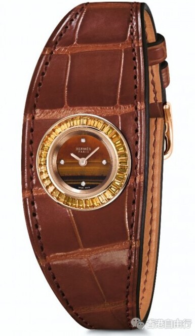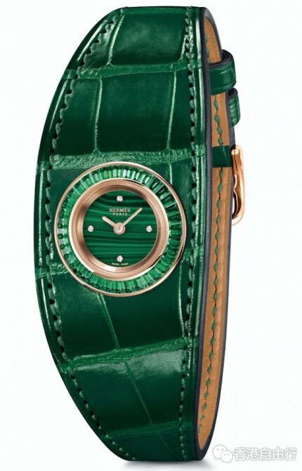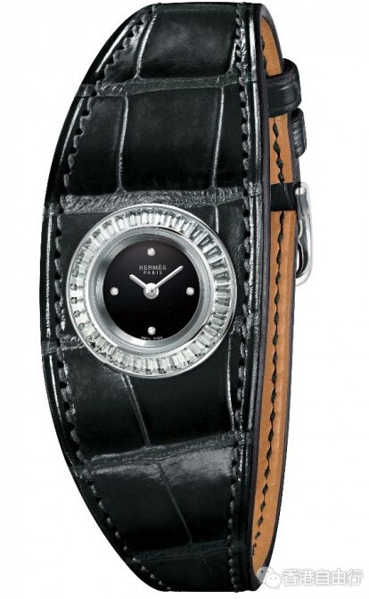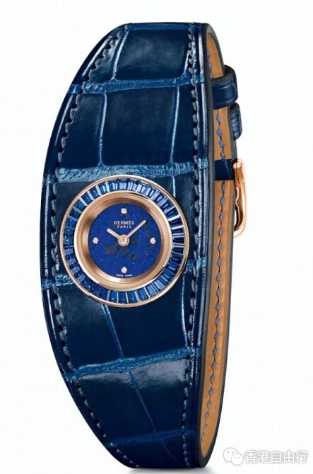 化身第二层肌肤的皮革在腕上流动,犹如表壳的延伸。爱马仕精制的贵金属表壳以全手工方式镶嵌36枚梯形切割宝石。钻石、祖母绿、蓝宝石或咖啡色蓝宝石:宝石切割工匠需要为每枚宝石进行独立精准的切割。随后镶嵌工匠将宝石安置于表框的凹槽,然后以镶嵌推刀将凹槽周围材质推向宝石,轻轻敲打,直至宝石牢牢固定在位置上。最后是抛光工序,以显现作品的光辉闪耀。