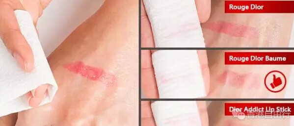 在手背画上唇膏,然后喷水并以纸巾抹开,来测试其防水度。3款唇膏的防水效果都不错,反而Rouge Dior Baume唇膏防水度略胜一筹。