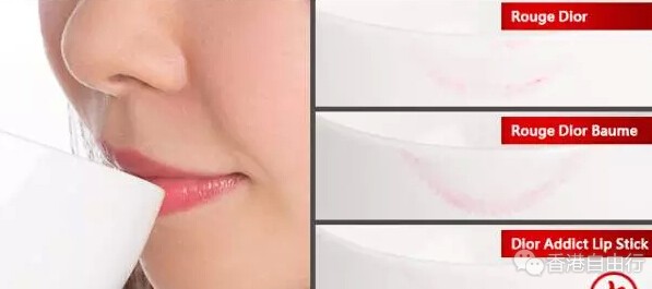 涂上唇膏后,待约1分钟,把唇印在杯上,观察唇印的深浅度,以比较唇膏的持久效果。3款唇膏的持久度都很称职,而Dior Addict唇膏则较为持久。