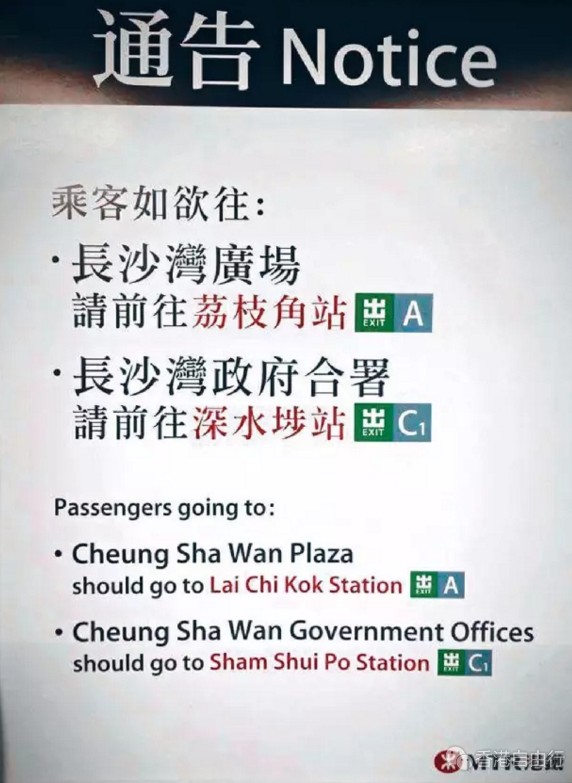 近日,网上热传一张港铁通知相片,提醒乘客前往长沙湾广场要到荔枝角站出口,前往长沙湾政府合署则要到深水埗站。就算是香港人,有时候也会分不清到底该在哪里下车。