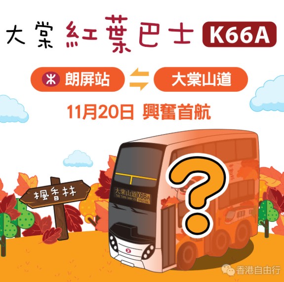 据悉,港铁于2021年12月1日至2022年1月16日期间,逢周末及公众假期加开了「大棠红叶巴士」K66A,方便市民来回朗屏港铁站至大棠山道。而今年,红叶巴士K66A将于11月20日以全新面貌回归,服务路线与去年一样。除了特别巴士线红叶专车K66A外,赏红叶人士亦可于港铁朗屏站转乘巴士K66/红色小巴,于大棠山道巴士总站下车,并沿大棠山路上山。