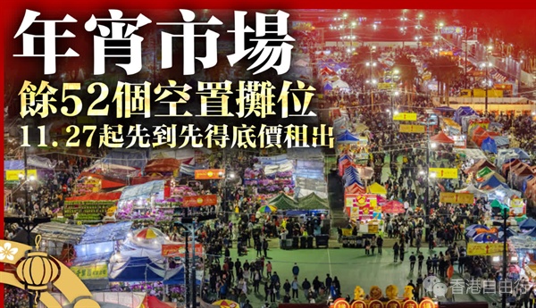 2026年农曆年宵市场于2月11至17日举行。食环署各区的年宵市场尚馀合共52个空置摊位,分别为3个快餐摊位、1个大型乾货摊位和48个普通型乾货摊位,由11月27日至12月3日以先到先得方式按底价供市民申请租用。
