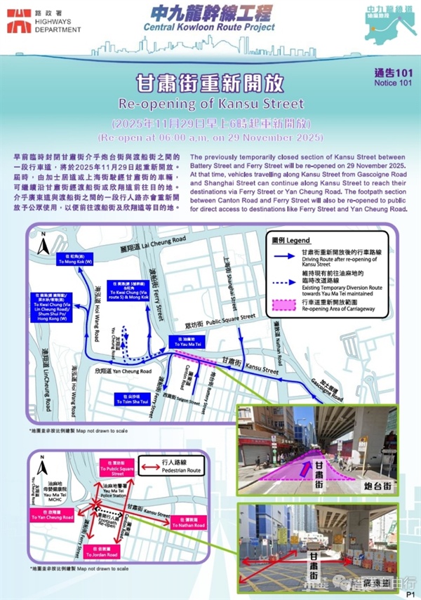 政府今日(20日)提醒市民,早前为配合兴建中九龙绕道(油麻地段)而临时封闭介乎炮台街与渡船街之间的一段甘肃街,将于11月29日(星期六)上午6时重新开放,并将实施交通及运输安排。
