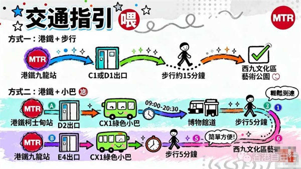 于港铁九龙站C1或D1出口,步行约15分钟可抵达西九文化区艺术公园。