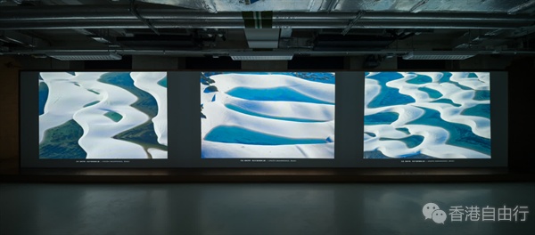 而《观静录》系列则引领观众仰望「天道」。在专设的暗厅中,佔据整面牆的巨幅流媒体影像缓缓铺陈开来。约16分钟的影片,集合了鲍皓昕游历世界、特别是航拍获得的64组自然景致,将包括西藏喜马拉雅山脉在内的壮阔尽收眼底。伴随着纾缓的音乐,观众在展览现场被无垠的天地包裹,身心更为沉静。这种沉浸式体验,旨在引导观者在静默中「观天地」,进而反观自身,于浩瀚宇宙中思索个人的定位,几近于一种心灵的疗癒。