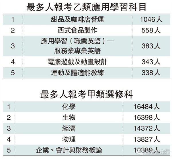在甲类选修科目中,最多学校考生报考的科目为化学,有16484人,其次为生物共16398人。今年共有59个乙类应用学习科目,共有7836名考生报考,最多人报考科目为甜品及咖啡店营运,共有1046人。