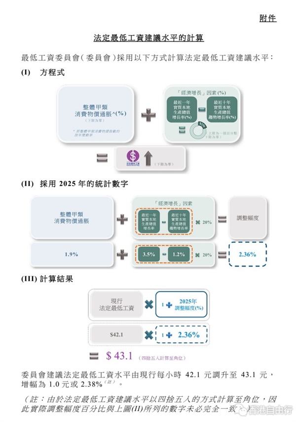 委员会按法定最低工资「一年一检」新机制,採用行政长官会同行政会议通过的方程式进行检讨,建议法定最低工资的新水平(见附件)。
