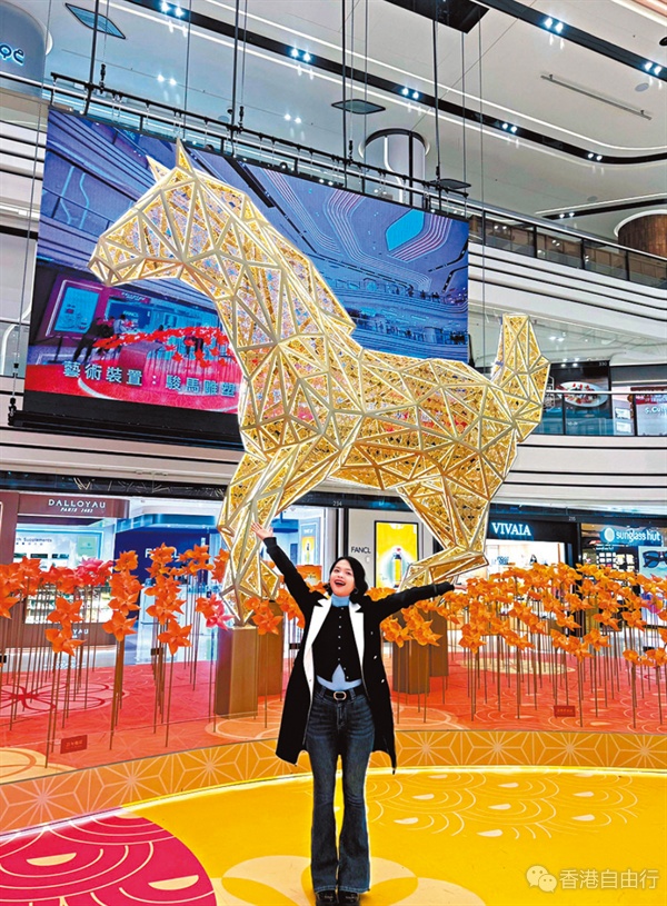 其中焦点装置为建筑师萧国健操刀的「骏马」艺术作品,高达六米,马身线条矫健,共有超过500片三角几何构件拼合而成,每片镂刻「福」字通花,全作共有逾2,800个福字,寓意福泽绵延。值得注意的是,马首特意朝向东北方,寓意「马首是瞻」,寄託新年马到功成、旗开得胜的美好祝愿。