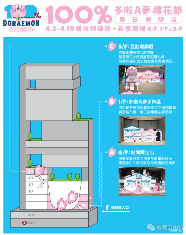 《100%多啦A梦&FRIENDS》再次回来香港!《100%多啦A梦&FRIENDS》巡迴特展为庆祝这场由香港主办的多啦A梦盛事在国际舞台大获成功,活动特别安排于巡迴特展的起点——香港,举办全新活动「100%多啦A梦樱花节」。
