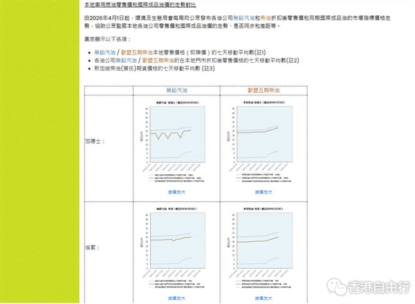 环境局指,原油与成品油是不同的产品,国际原油价格(例如伦敦布兰特原油)的变动与车用燃油零售价的调整未必同步。环境局在走势图表,採用国际成品油的市场指标价格与车用燃油零售价格作比较,协助公众监察本地各油公司零售价和国际成品油价的走势、是否同步和差距等。