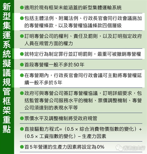 政府近年积极推动交通运输持续发展,包括引入「智慧绿色集体运输系统」,并已启动东九龙、启德及洪水桥/厦村新发展区3个相关项目。香港特区政府运输及物流局昨日向立法会提交文件建议引入一套技术中立、通用且标准化的规管框架,日后无须就每个系统另订主体法例。首段专营权一般不多于50年;票价水平及调整机制将受规管,採用直接驱动方程式票价调整机制,每年按消费物价指数和工资指数变化等数据进行上下调整,无须经任何机关审批。投标者建议的初始票价将成评标考虑因素之一。政府目标今年第四季向立法会提交主体法例的草案。当新法例生效后,料明年起由行政长官会同行政会议就上述3个项目批出营运系统及进行相关设计和建造工作的专营权。