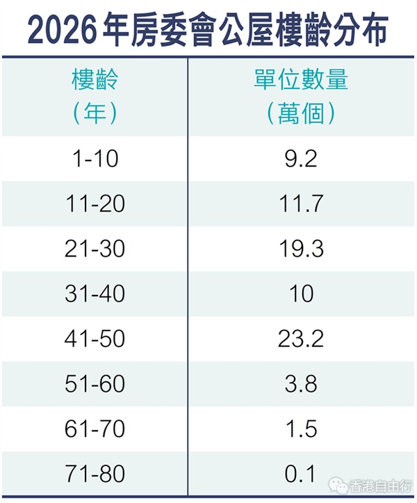 特区政府正全速编制香港首份五年规划,当中住屋是重点议题之一。目前,香港有不少楼龄偏高的公共屋邨,团结香港基金昨日发表《香港房屋趋势导航2026》报告,就公营房屋问题建言,预计未来10年,房屋委员会辖下将有超过23万个公屋单位达50年楼龄,每个单位的平均维修及改善工程开支将持续上升,故提出三大建议,包括政府系统性推动高龄屋邨重建,当中以禾輋邨、大兴邨、丽瑶邨及沥源邨有较高重建价值;提议每年将10%至15%的公营房屋落成量,预留作安置受重建影响的公屋居民;并在合适项目增加重建后的资助出售房屋比例,将建屋淨支出大幅降低78%。
